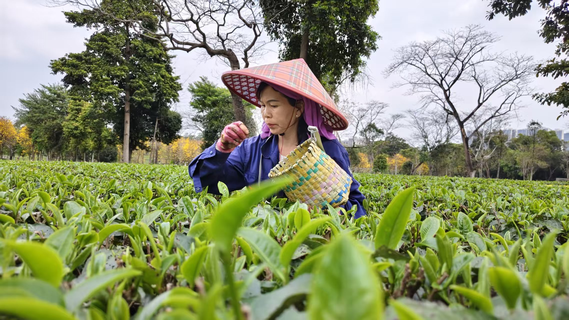 阳光明媚,欧美日韩国产二区春暖花开,广东鸿雁茶业有限公司员工在采摘春茶,在蓝色的工服点缀下,春色满园显得更加生机蓬勃。