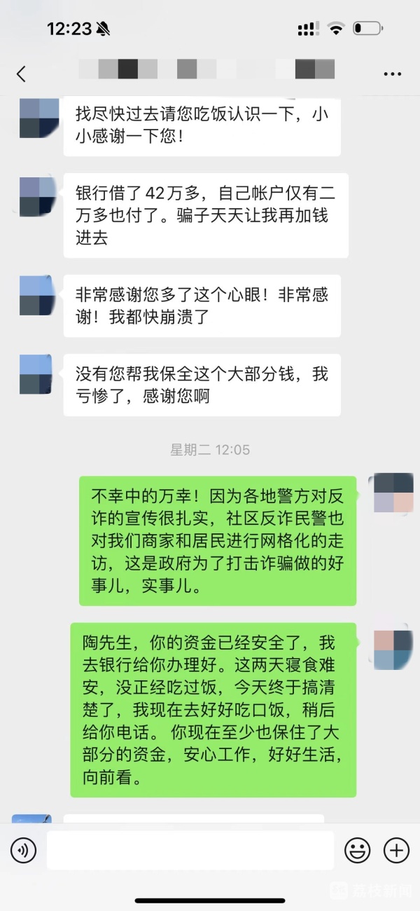 刘先生说,投资的40多万有些是借的,意识到被骗时非常崩溃。但得知其中一部分钱被南京市民姜先生保住了,激动不已,他加了姜先生的微信,对姜先生表达了谢意:“现在姜先生帮我的一笔扣住了,我的损失只有一半不到,我就很感动。有姜先生这笔钱,也是减少一大半损失,这对我来说,也是一个惨痛的损失”。