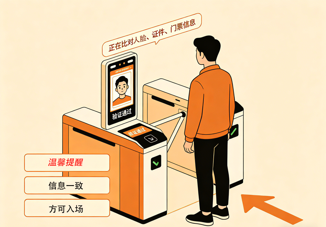 入场核验:人、证、票三者信息必须完全一致。入场时,您需携带本人购票时登记的有效身份证件原件(如身份证),通过闸机进行人脸识别。系统将同时比对人、证、票信息,三者匹配成功方可入场。