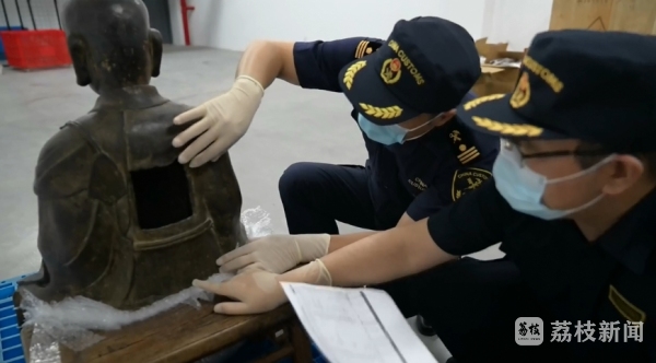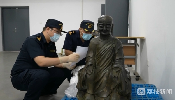 此前,南通海关关员在查验时发现一票货物风险较高,遂实施选查布控,经开拆查验发现内有青铜佛像一件,毛重96.9公斤,造型精美,欧美日韩二佛像及其配套坐凳外观斑驳,且背面刻有“万历”等字样铭文,距今已有400多年历史。经专业机构鉴定,该青铜佛像属于禁止出境文物。目前,南通海关缉私分局正在开展进一步侦查。